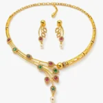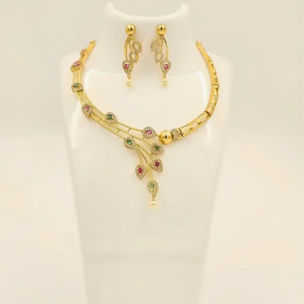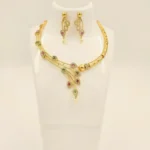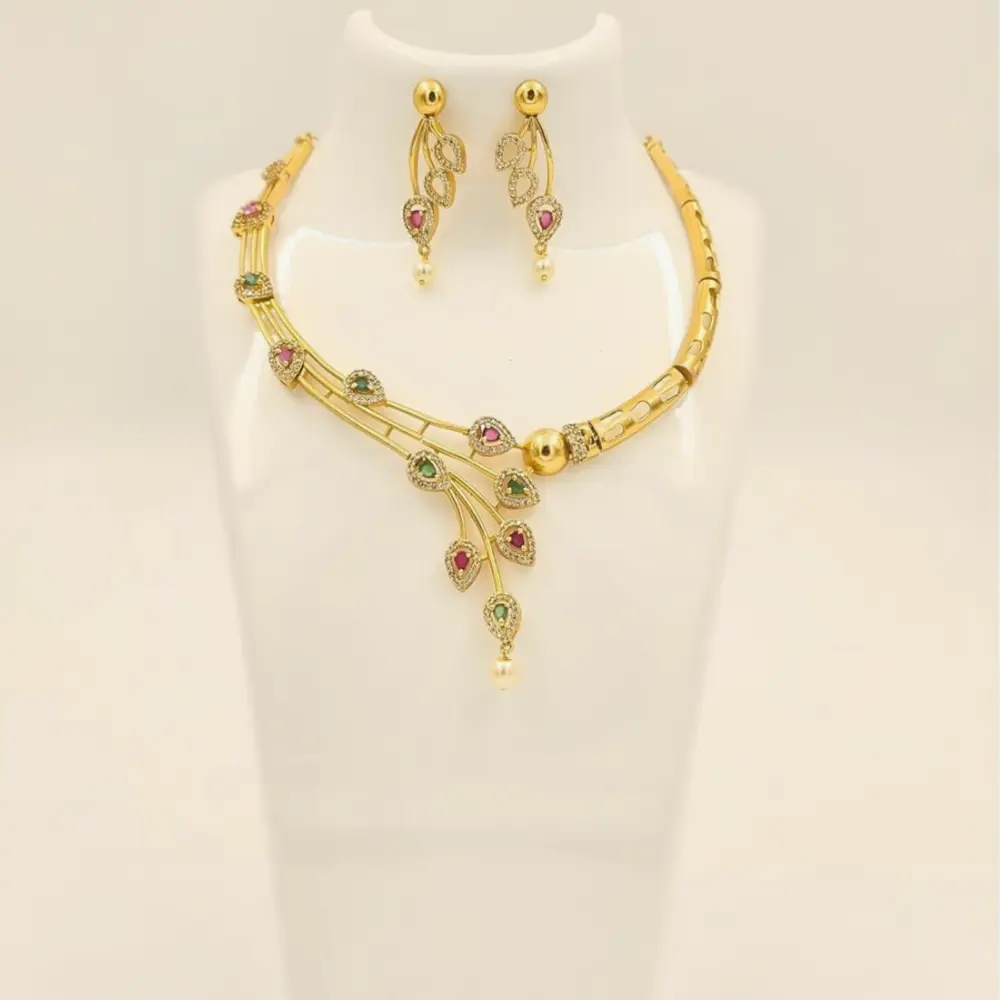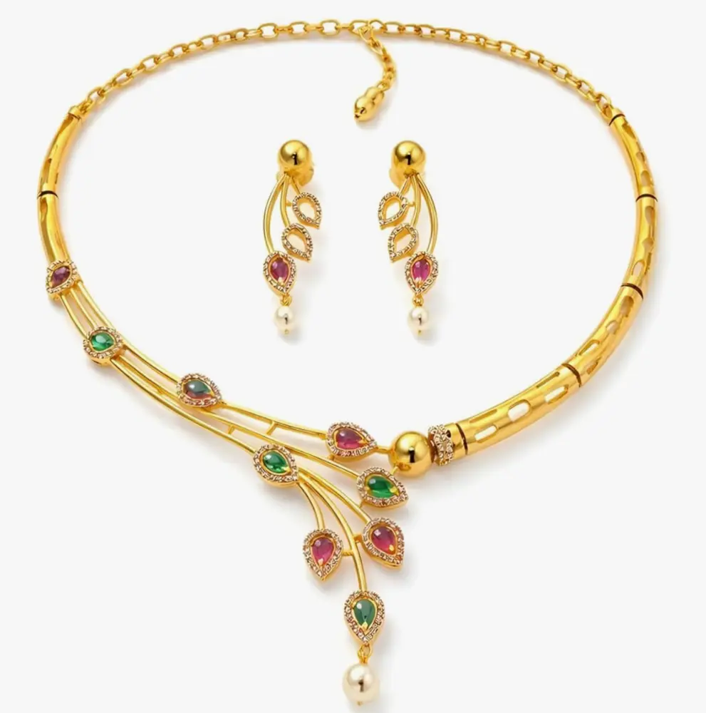 This set is a showstopper; the intricate flower bouquet design combined with the antique gold and vibrant red/green stones is simply breathtaking and luxurious.