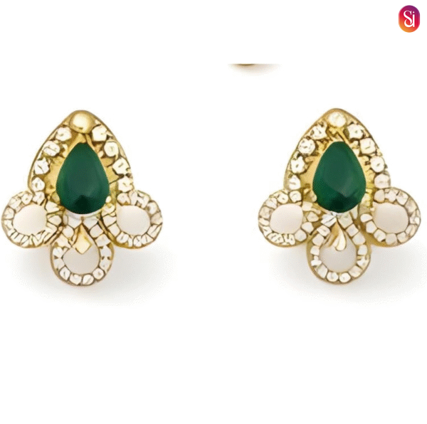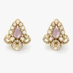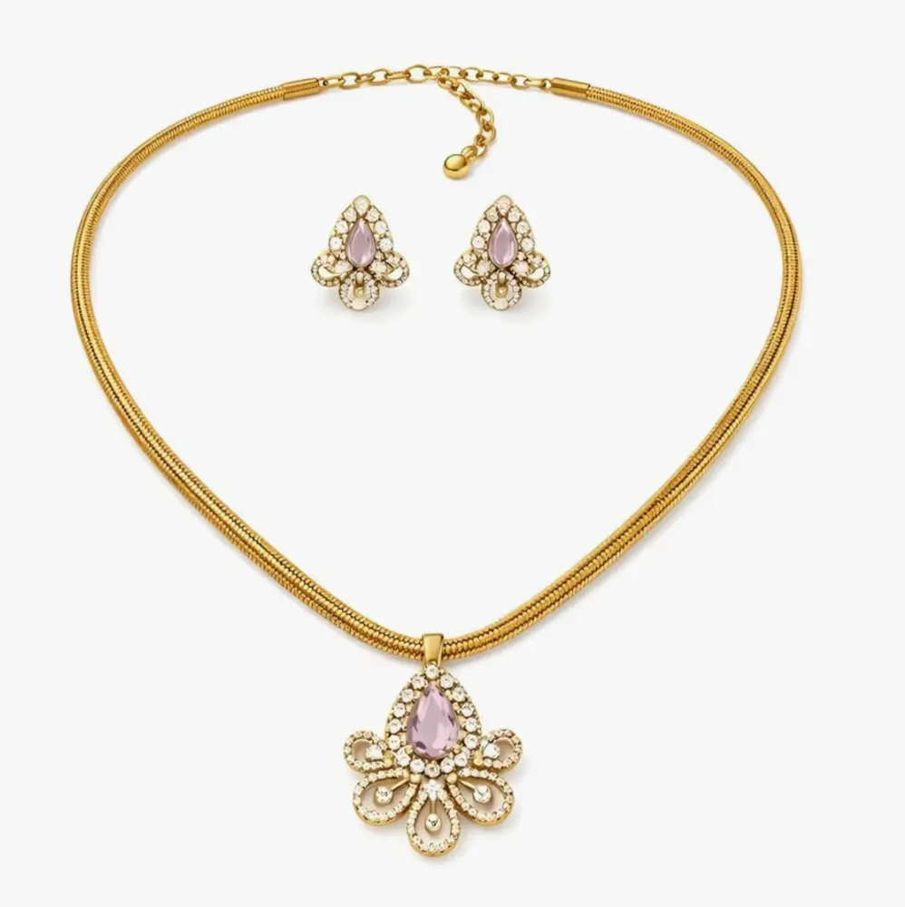 This gold pendant and earrings set includes a pair of matching stud earrings. These studs mirror the floral element of the pendant, providing a balanced and harmonious look that frames the face with a subtle golden glow.