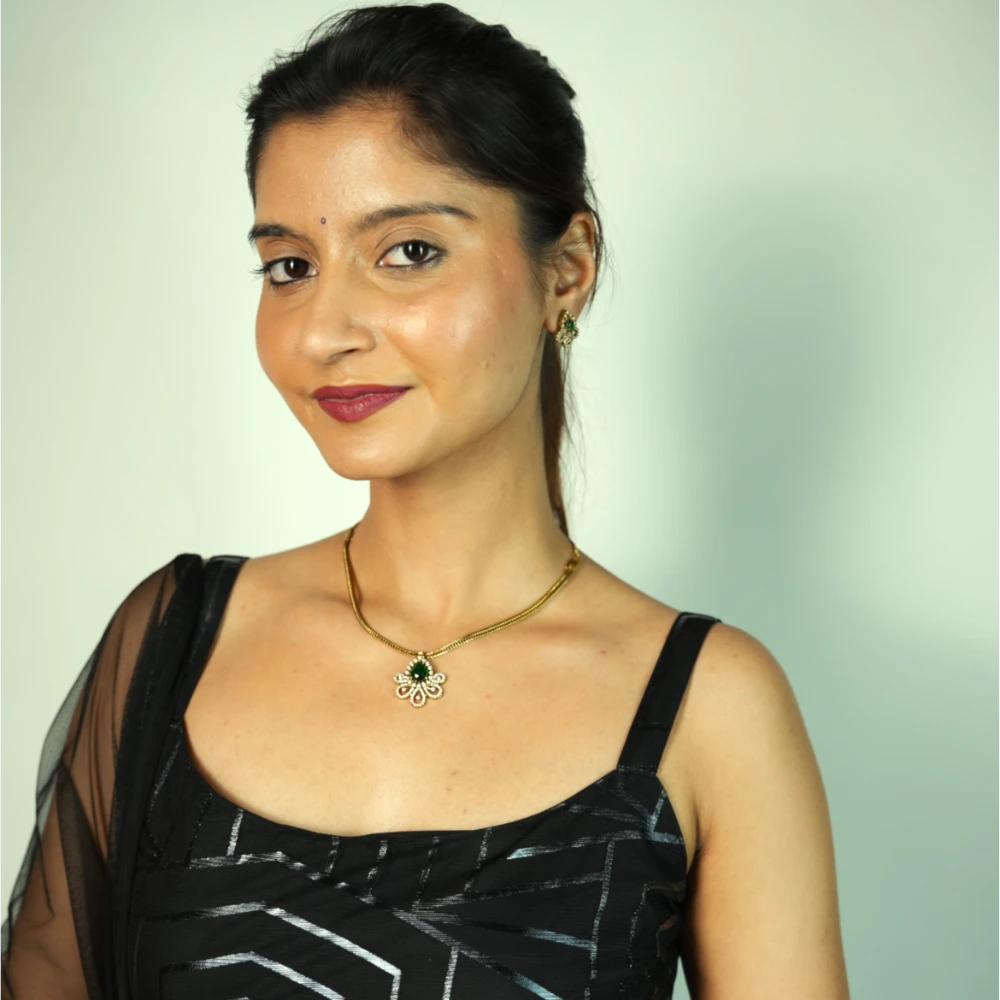 At the heart of the blossom lies a stunning teardrop centerpiece. This faceted stone is cut to provide maximum brilliance, drawing the eye toward the center of the pendant and adding a touch of sophisticated drama to the overall festive wear aesthetic.
