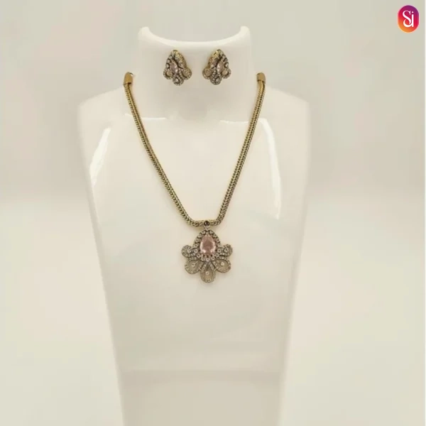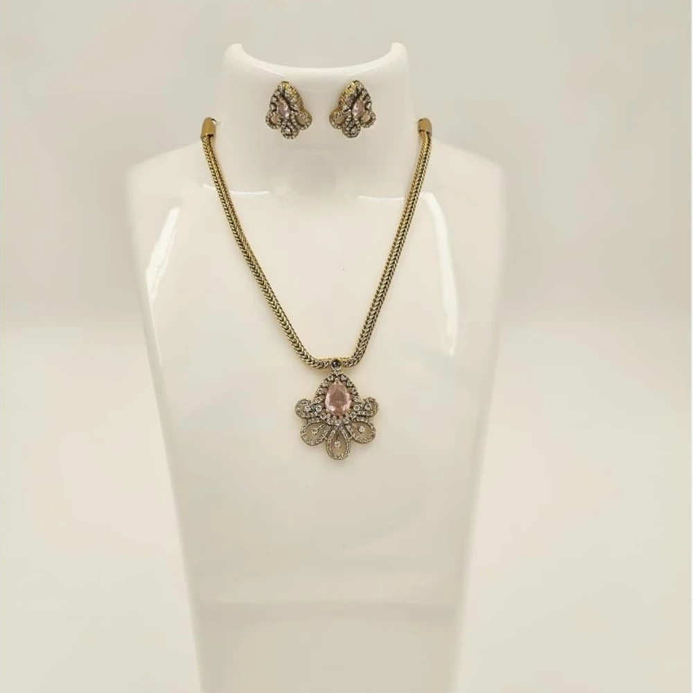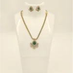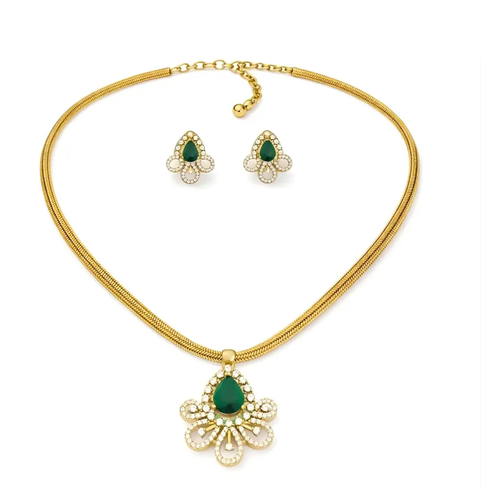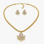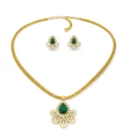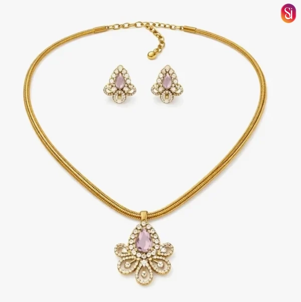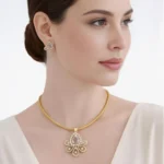 The pendant features a meticulously crafted floral motif that serves as the foundation for its beauty. This gold pendant set uses curved petals and intricate metalwork to create a 3D effect, ensuring it catches the light from every angle.