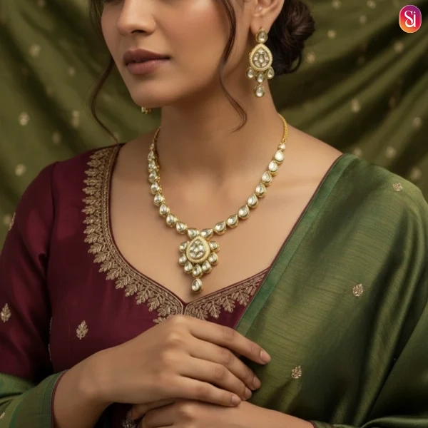 Includes a stunning Kundan necklace and a pair of matching earrings for a cohesive and elegant look.