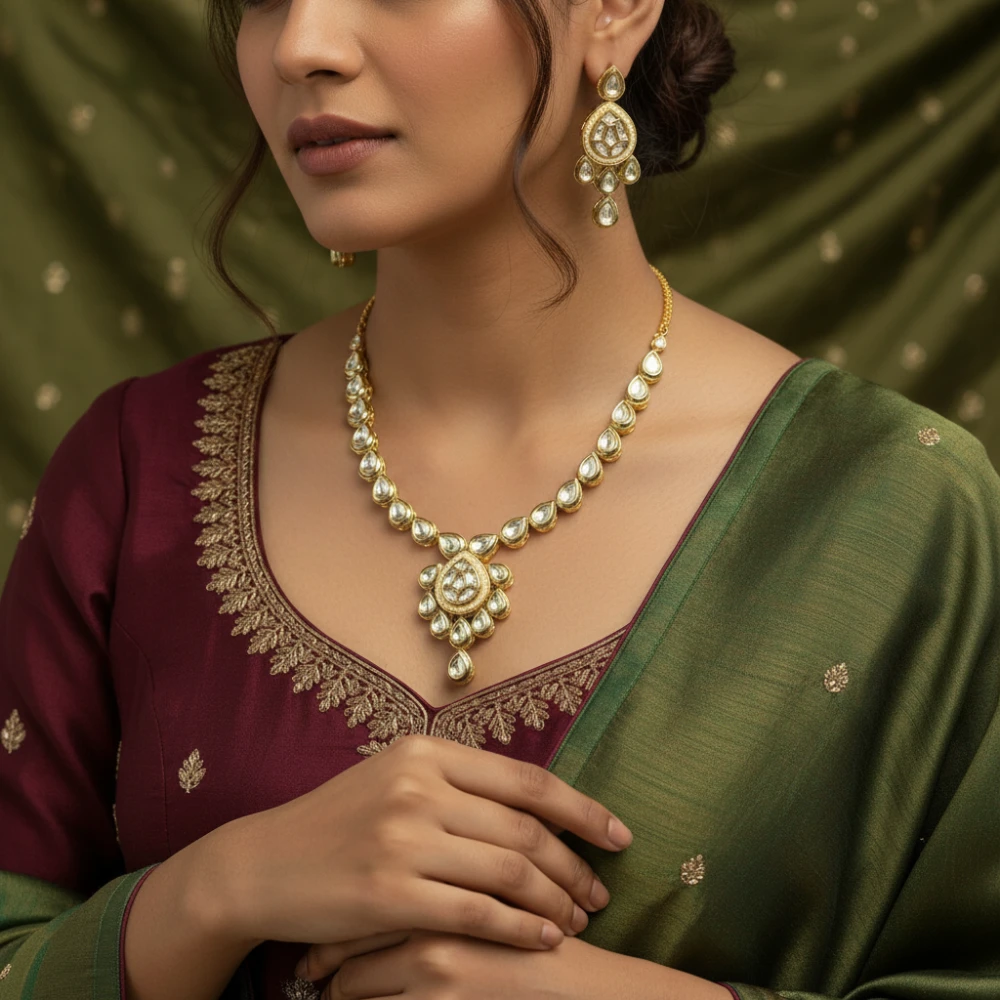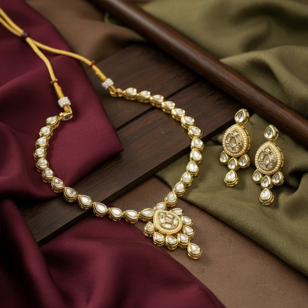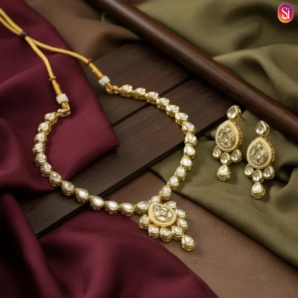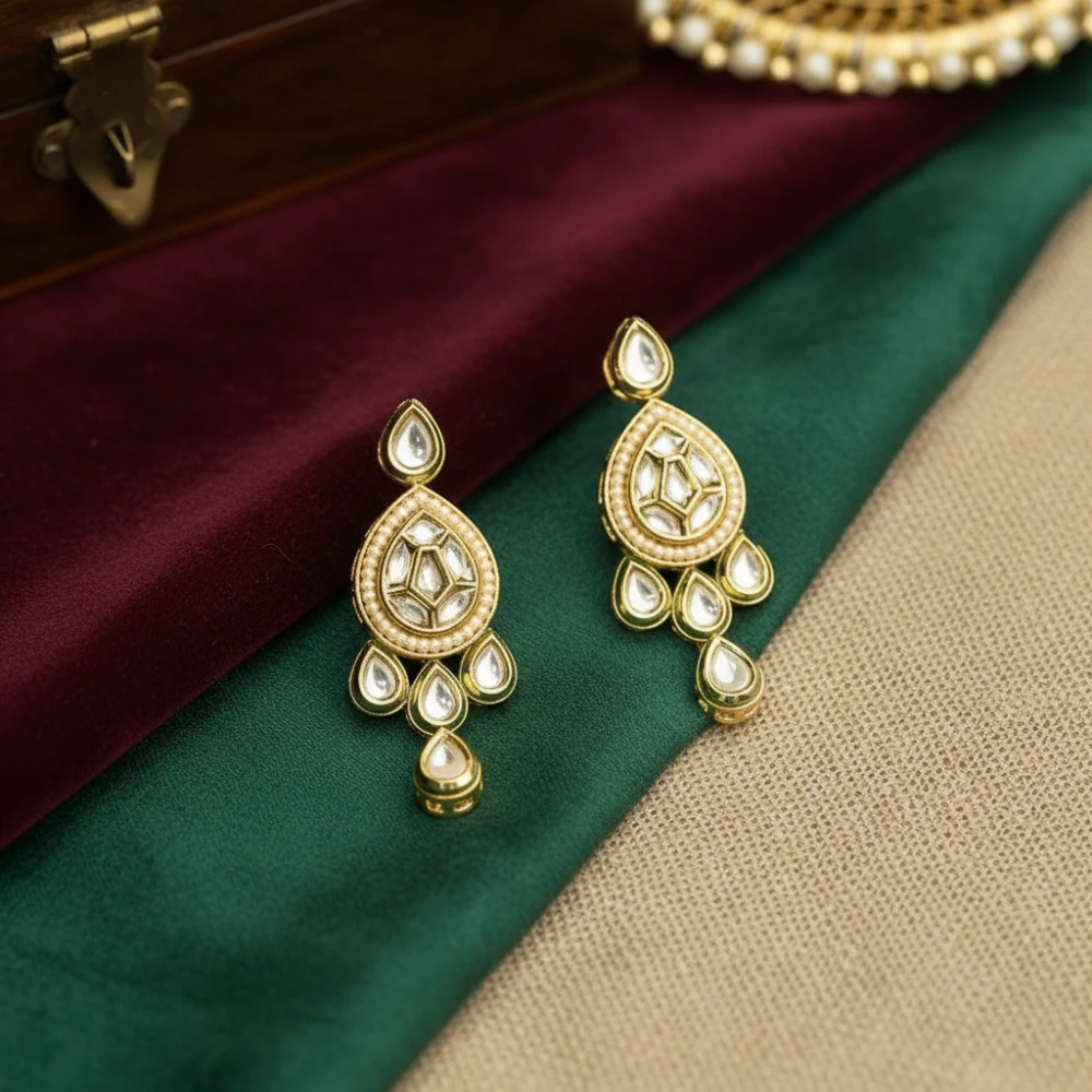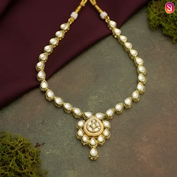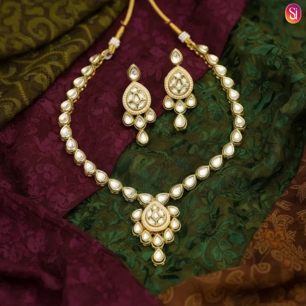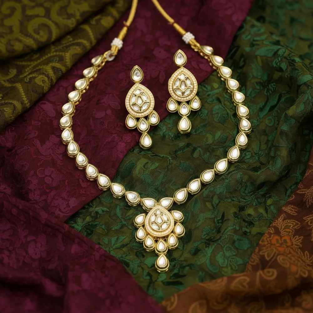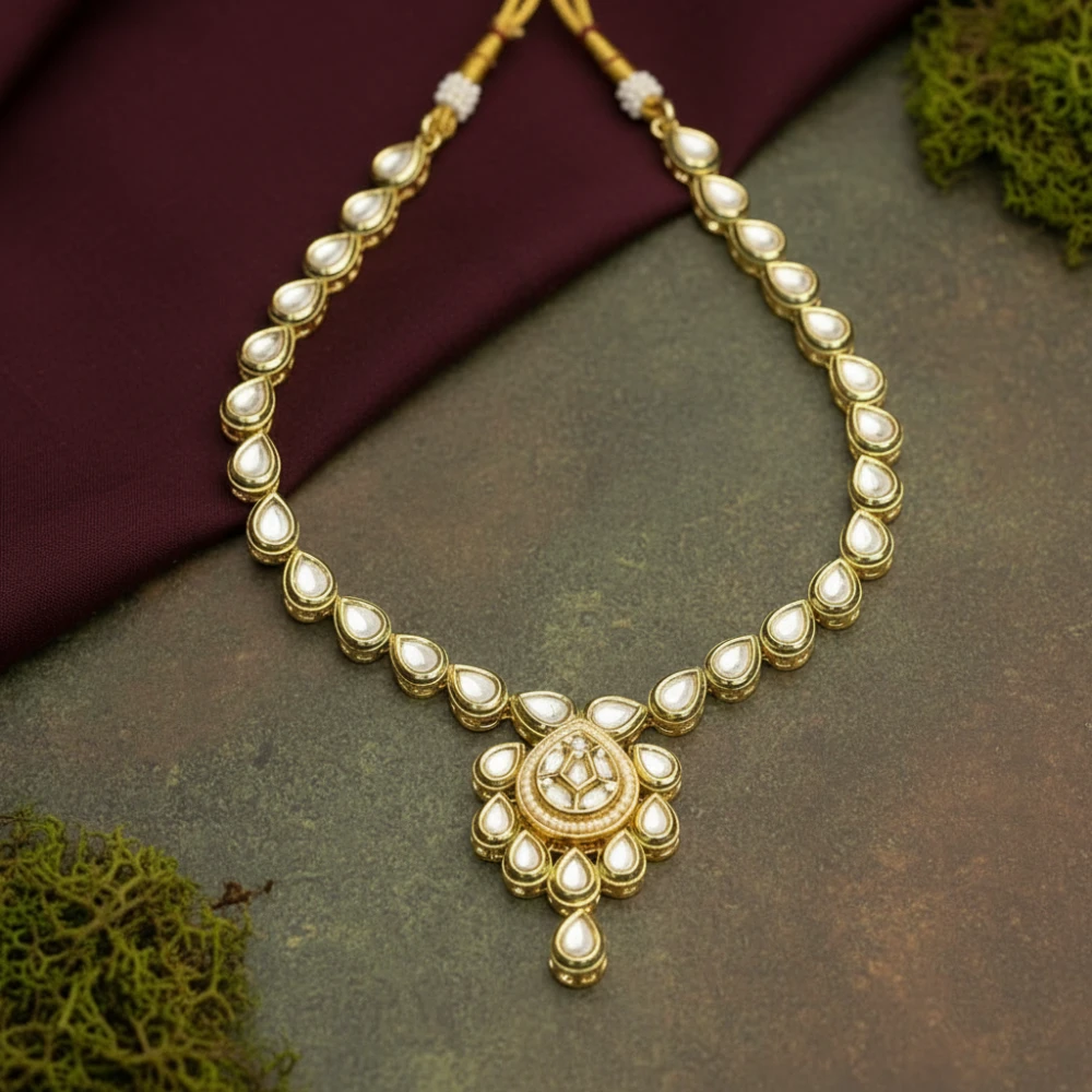 Meticulously handcrafted with teardrop-shaped Kundan stones and Polki, set in a radiant gold-tone base.