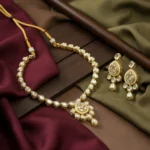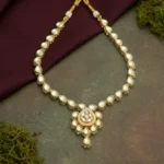 I love the traditional artistry of the Kundan work, perfectly paired with the flowing pearl drops. The choker sits gorgeously on the neck, delivering a truly majestic look.