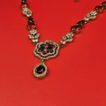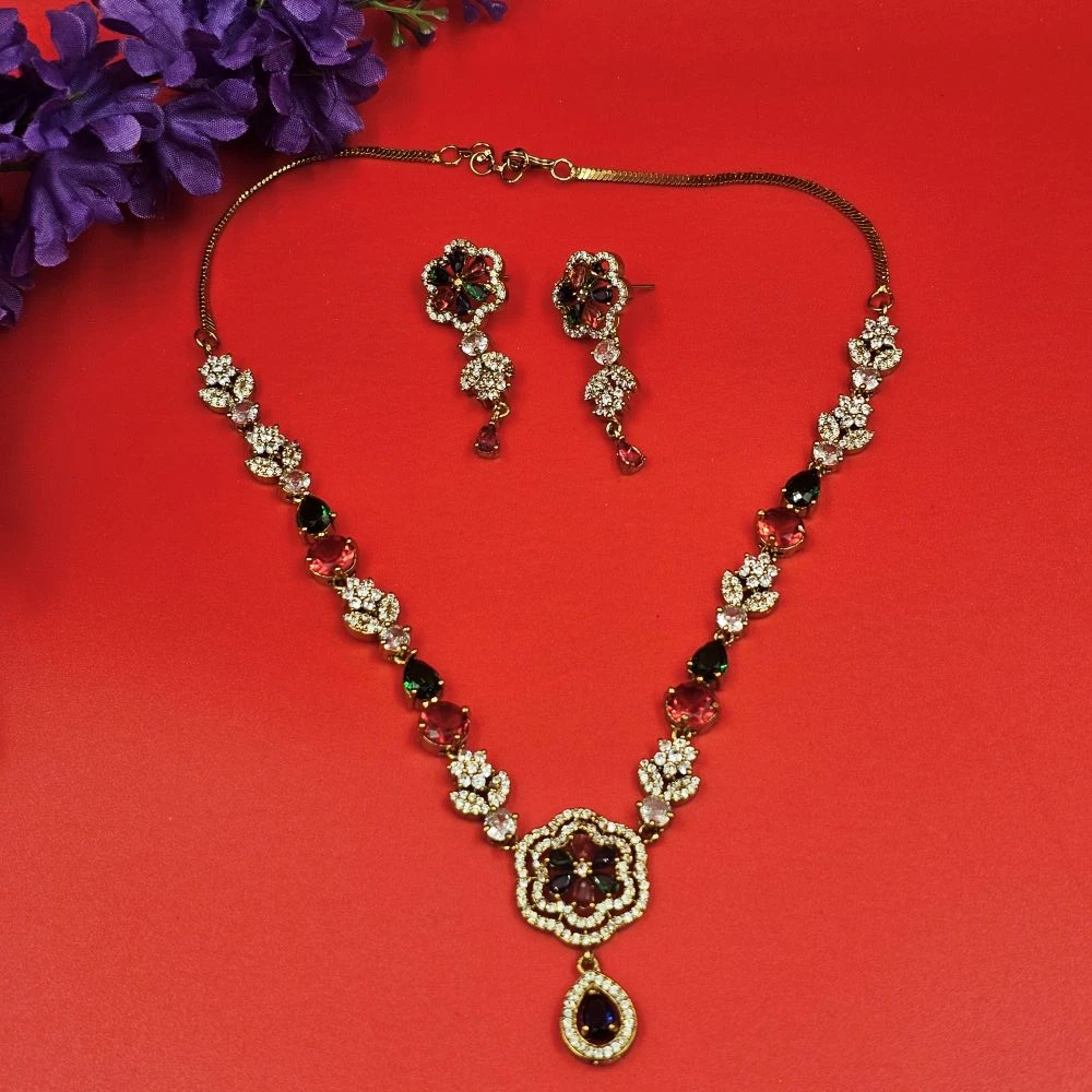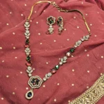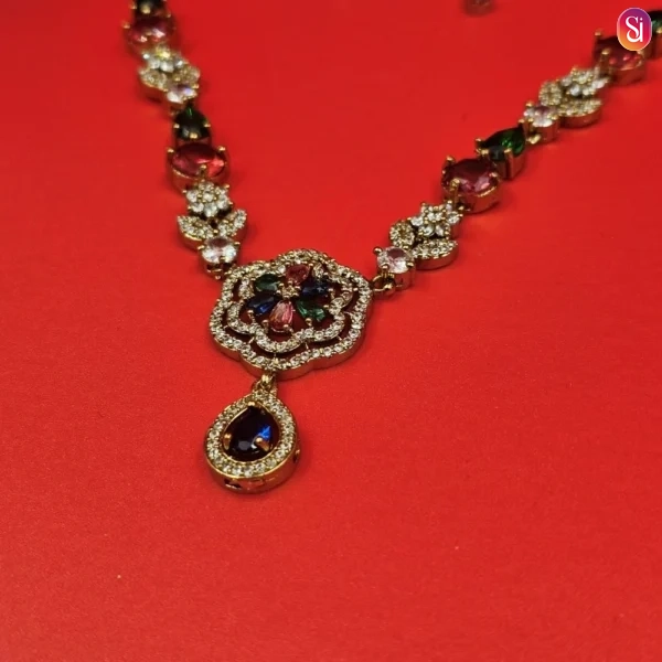 The centerpiece of this jewellery set is an intricately crafted floral motif. Adorned with premium American diamond and crystal embellishments, the petals catch the light from every angle, offering the fire and brilliance of a ruby diamond necklace set with a modern, botanical twist.