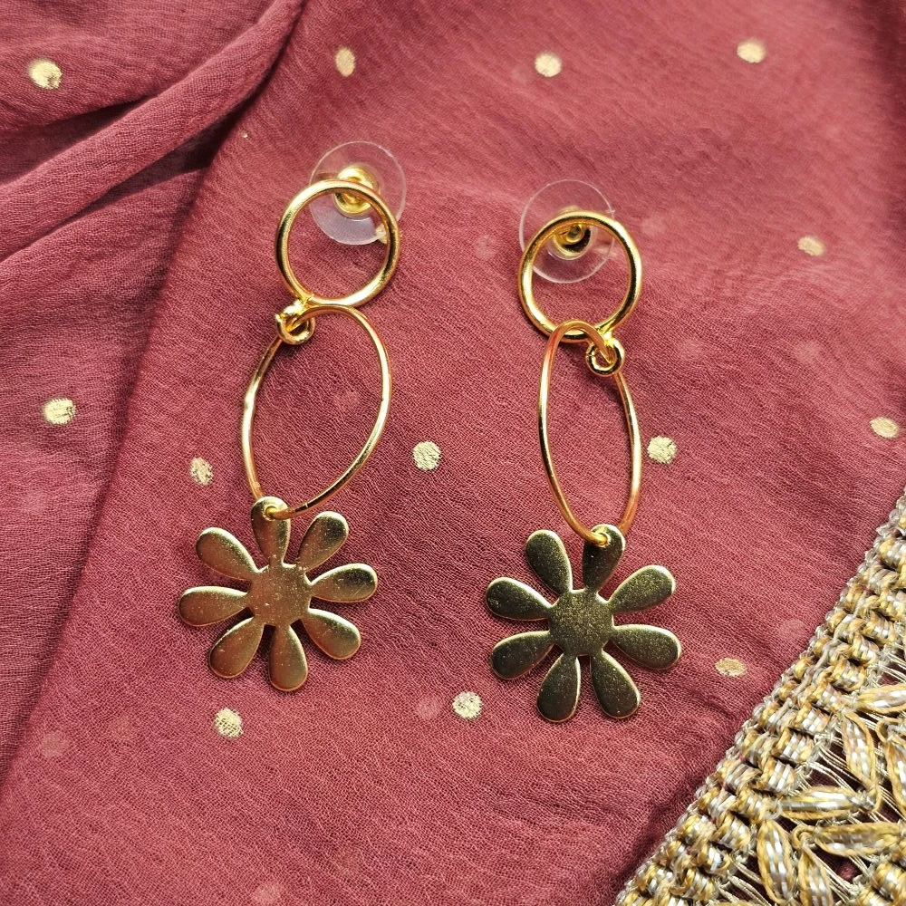 Forged from high-quality brass and finished with a rich gold plated layer, these gold flower drop earrings offer a radiant glow. The plating is meticulously applied to ensure a lasting luster that mirrors the brilliance of solid gold.