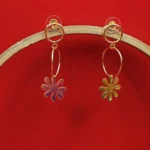 Inspired by the fluid movement of blossoms caught in a gentle breeze, these flower drop earrings are designed to bring a sense of motion and life to your style. The design centers around a delicate metallic bloom suspended within a golden frame, capturing a moment of botanical perfection. These hanging flower earrings are crafted for the modern woman who seeks a balance between nature-inspired whimsy and structured elegance, making them a standout piece in any Indian jewellery wardrobe.
