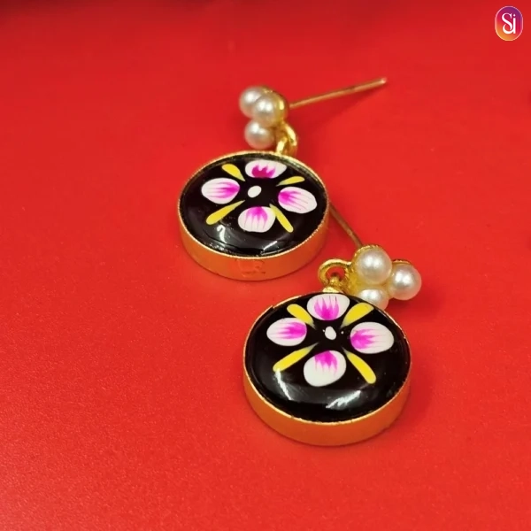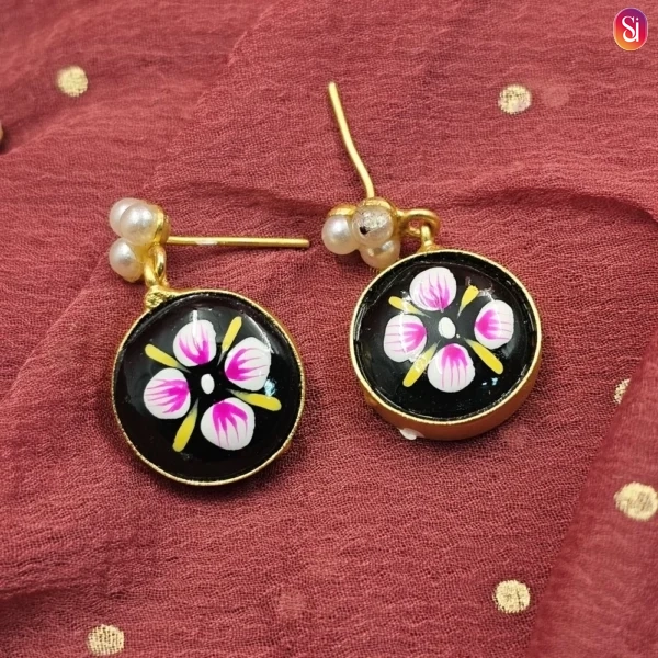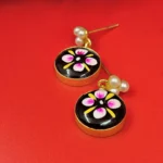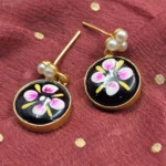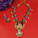 The set comes complete with matching earrings with painted flowers. These earrings mirror the central theme of the necklace, framing the face with vibrant colors and traditional “butti” patterns that capture the essence of kundan meenakari necklace set designs.