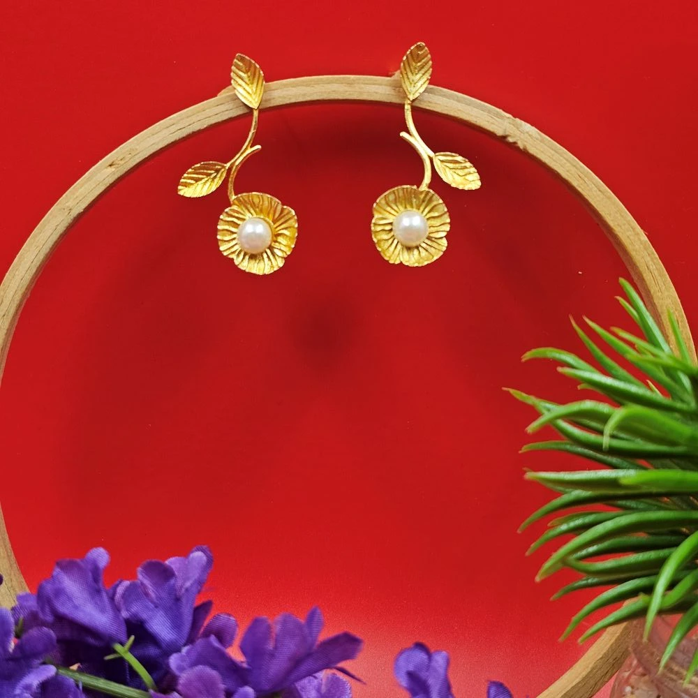 The base of each earring is finished with a fringe of delicate brass leaf that add a classic, sophisticated touch. These hanging accents enhance fluidity and add a touch of playful elegance to the flower earrings with pearl design.