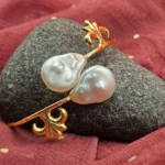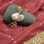 At the heart of the design are pearls set within a handcrafted pattern. Their smooth surface and natural shimmer provide a stunning contrast to the textured brass, creating a balanced and harmonious aesthetic.
