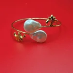 The brass bracelet features a unique, handcrafted brass pattern that gracefully frames the central pearls. This artistic detail adds texture and a bespoke feel to the design, ensuring a sophisticated look that catches the light beautifully.