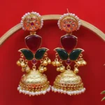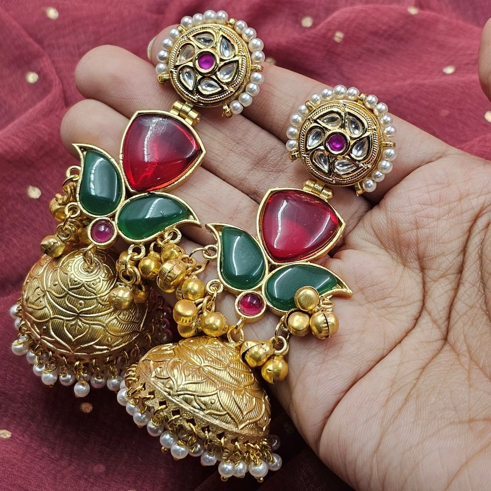 Ideal for Diwali, Eid, or family pujas, these kundan jadau jhumka pieces add a festive glow to your face. The pops of color from the Monalisa stones ensure you stand out in every photograph.