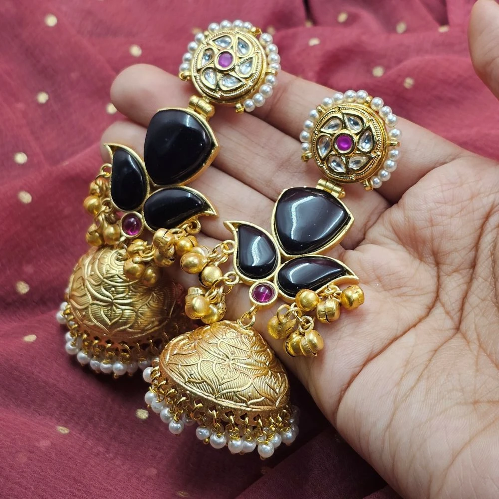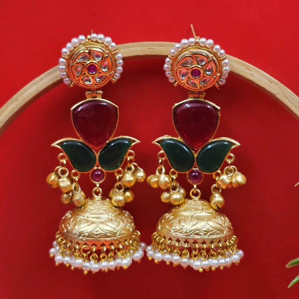 These are the perfect wedding jhumka earrings to pair with a heavy Banarasi saree, a silk lehenga, or a traditional Rajputana Poshak. The antique gold finish and Kundan sparkle make them an essential for any bridal trousseau.