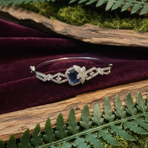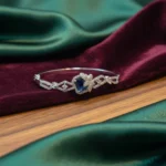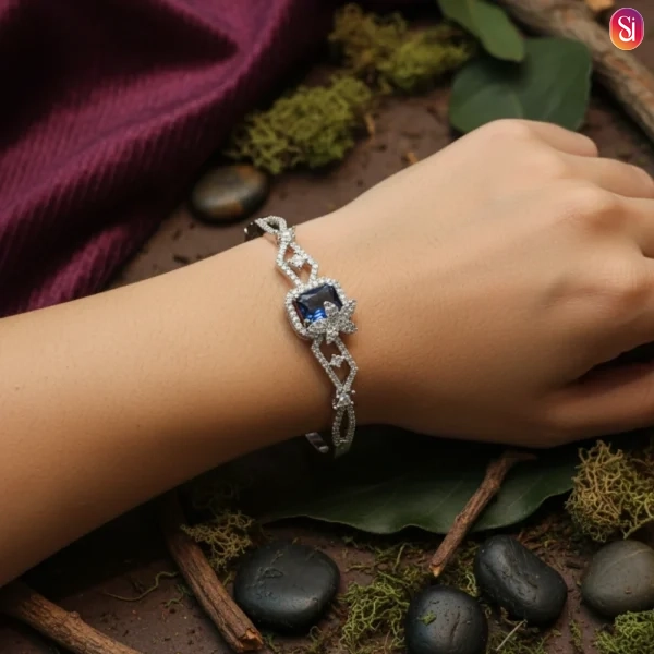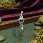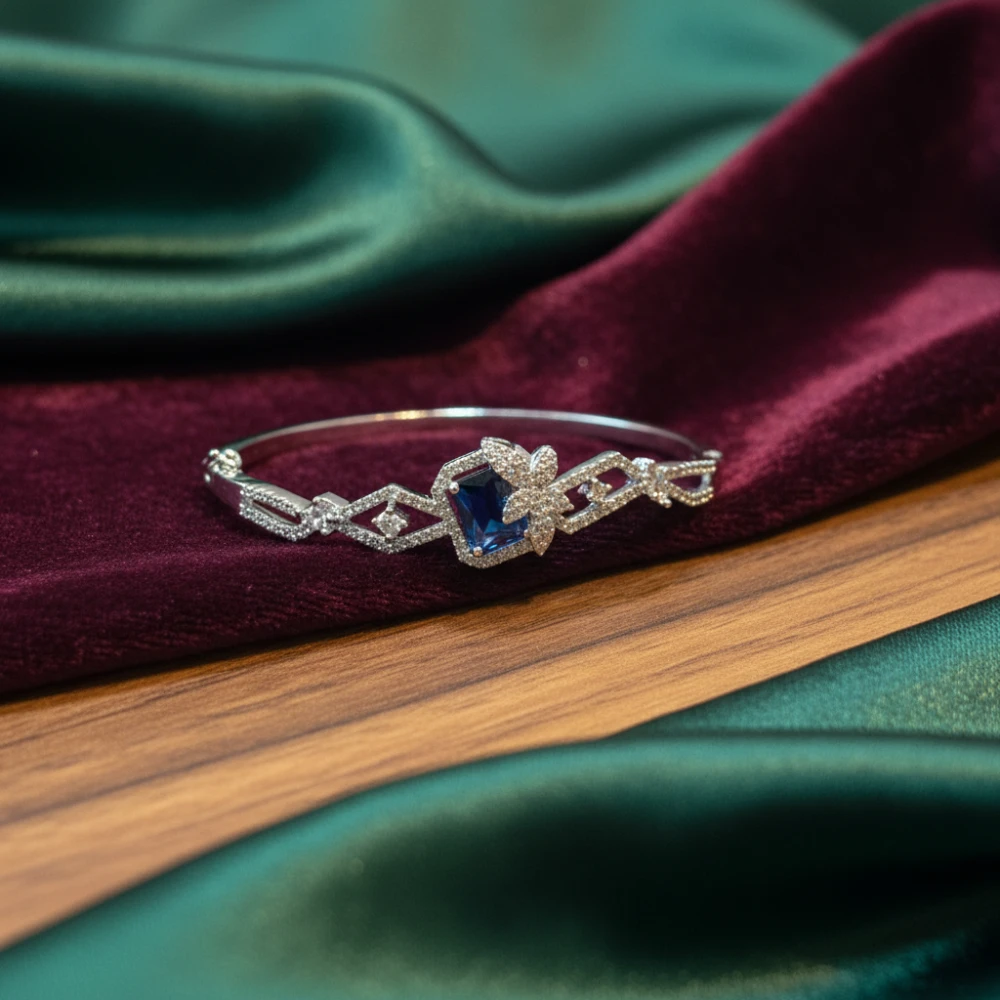 Features a deep, emerald-cut royal blue crystal that serves as a captivating centerpiece, echoing the luxurious charm of a fine sapphire.